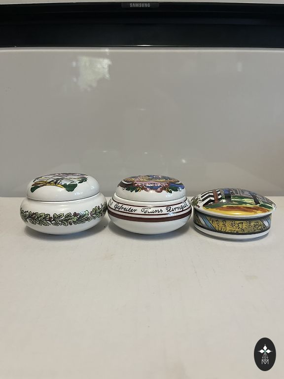 Porcelāna tablešu kārbiņas "Delft Blue" stilā. Mini-škatuliņas ar holandiešu balto-zilo apgleznojumu (dzirnavas), zīmogs AMSEL uz apakšas. Piemērotas tabletēm, vitamīniem, gredzeniem un auskariem. Izmērs: diametrs ~4 cm, augstums ~3 cm. Stāvoklis: jaunas. Pārdodu pa pāriem; iespējams arī pa vienai. Rūpīgi iepakotas. Cena: norādīta par 1 gab. Iespējama piegāde par papildus samaksu.