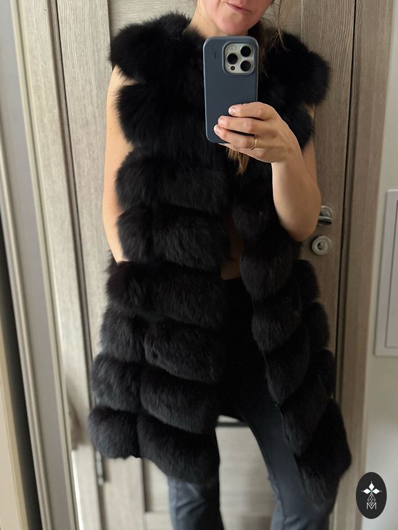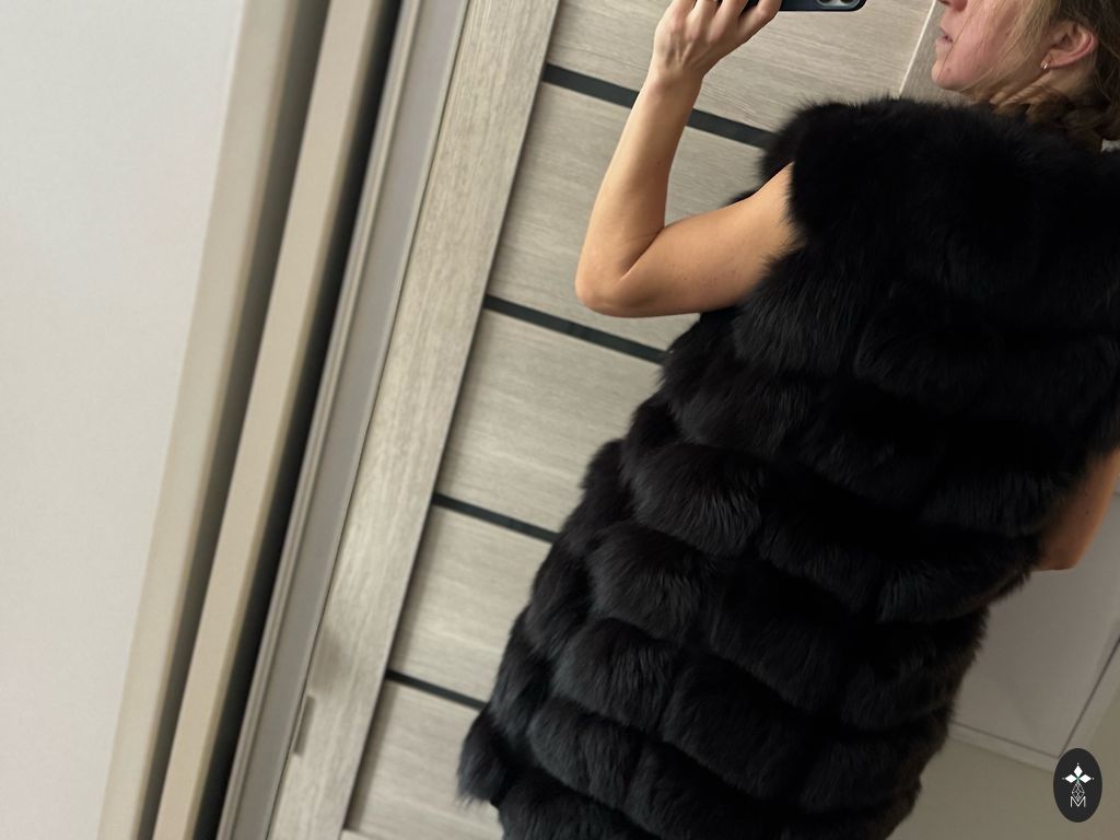 Natūralių kailių liemenė iš turtingo poliarinės lapės kailio, gražios melsvai pilkos spalvos, pamušalas šviesiai pilkas šilkinis audinys su klasikiniu agurkų raštu, ilgis virš sėdmenų su kišenėmis, užsegimas su paslėptais kabliukais, yra viena paslėpta vidinė kišenė.
