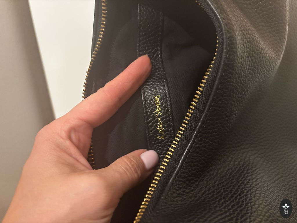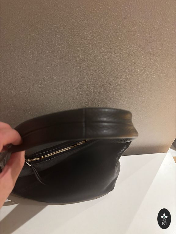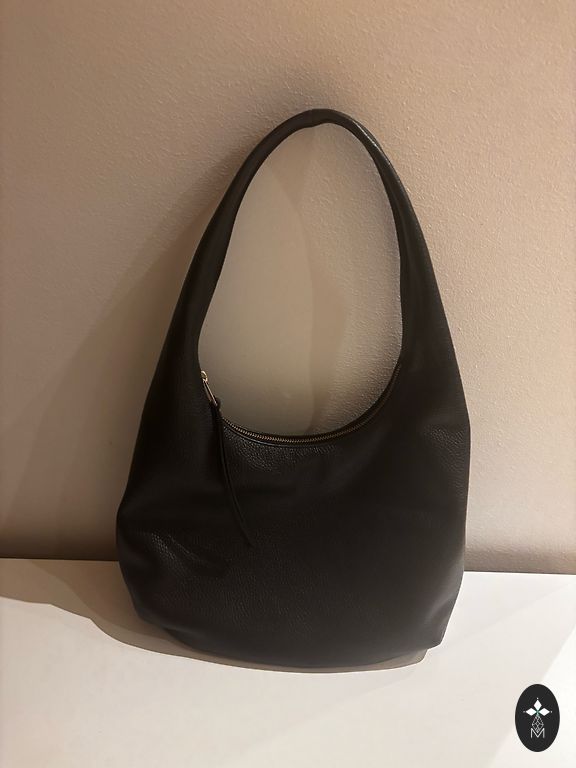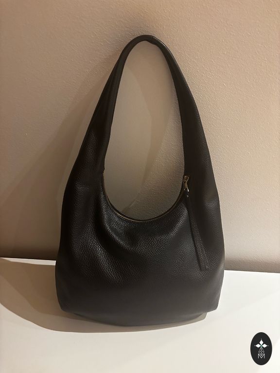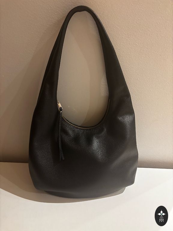 The exhaustion of a shopaholic's instinct, looking for a new owner. The bag is spacious, even enough room for a laptop. There is an inner pocket with a zipper, and the bag itself closes with a button. The strap is adjustable and comfortable. The top edge of the bag (visible in the last picture) is slightly cracked, but it doesn't hinder usage and is not conspicuously noticeable.