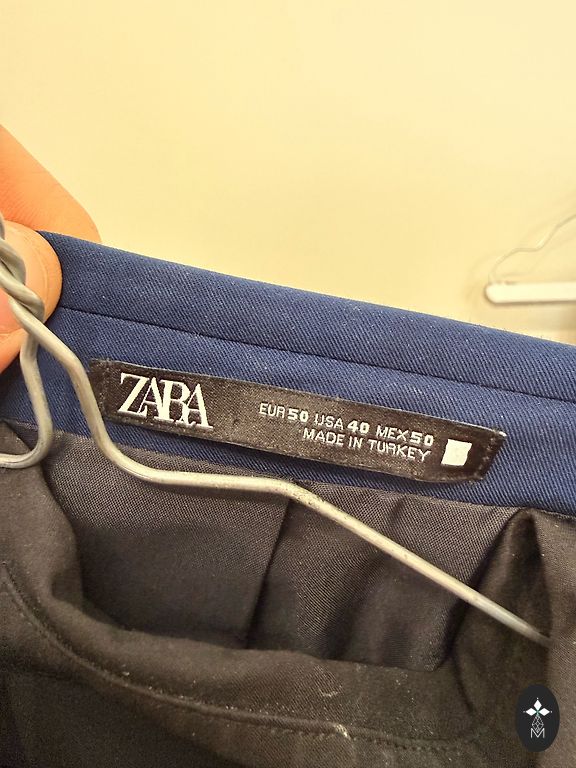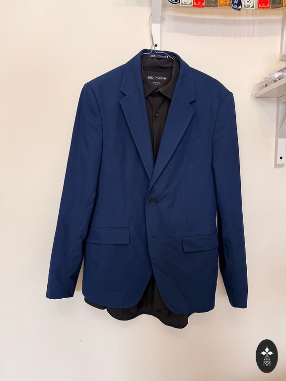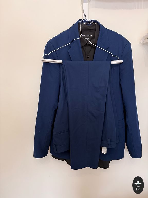 Продаю костюм с брюками синего-черного цвета. В отличном состоянии, был надет один раз, куплен в Великобритании. Размер костюма: длина рукава 66 см, длина костюма 73 см, обхват груди 115 см, размер EUR 52. Размер брюк: длина 101 см, размер EUR 44.