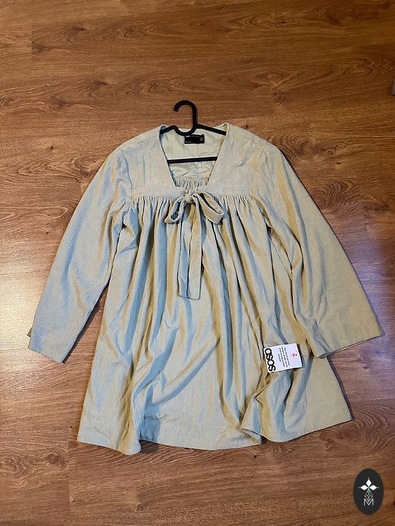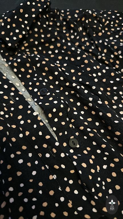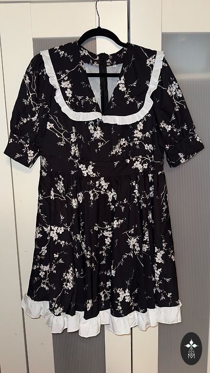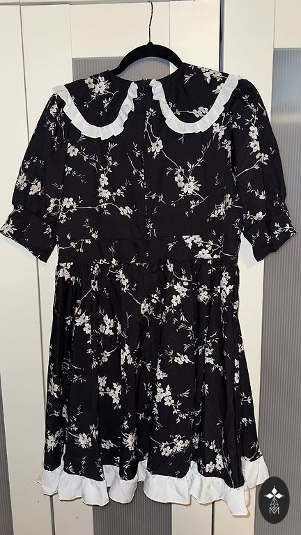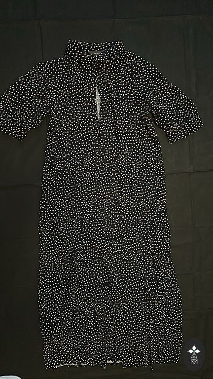 A patterned chiffon dress. An elastic waistband is integrated at the waist, and a separate tie belt is included. Suitable for size S.