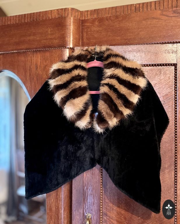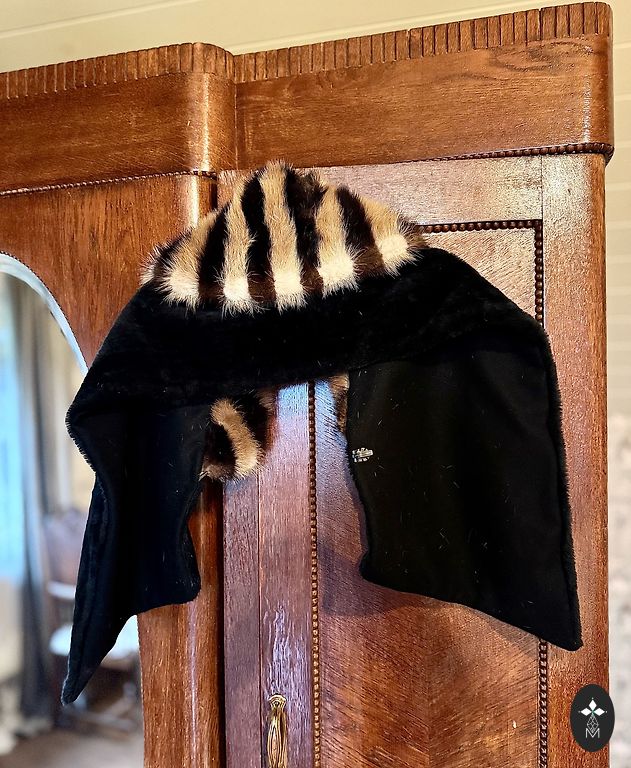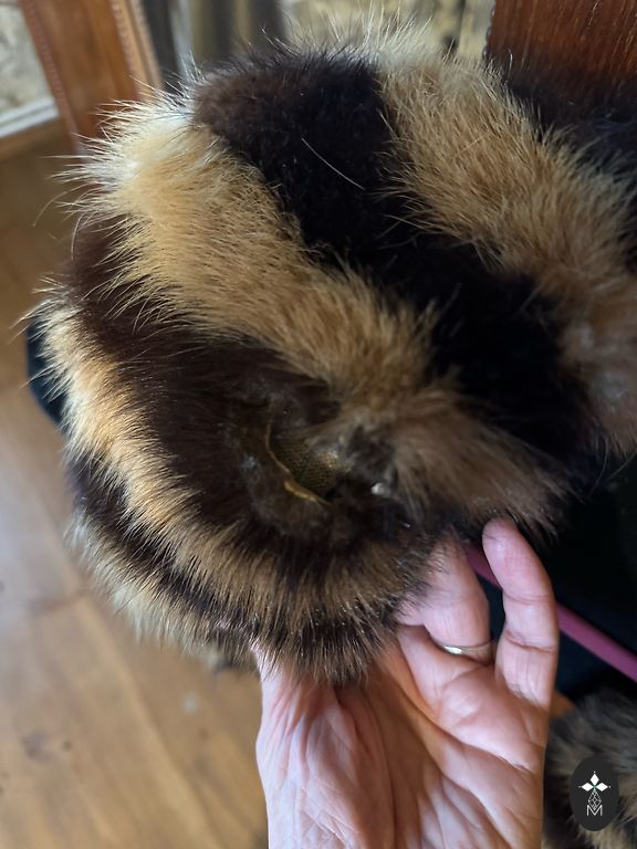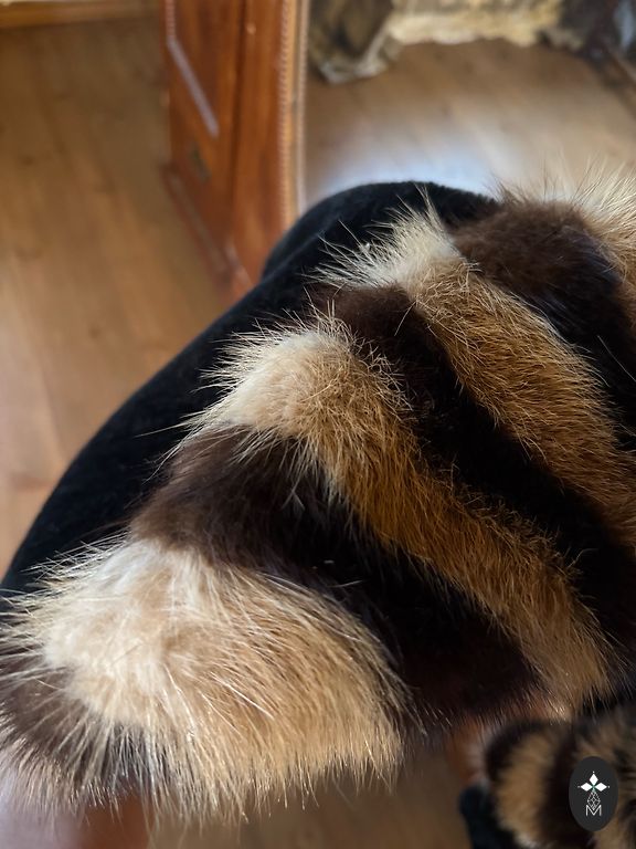 Apsiaustas. Jei tavęs negąsdina, kad yra kokia skylė ir šiek tiek byra plunksnos, tuomet gali pasipuošti kokiam karnavalui. Arba panaudoti kokiems kitiems rankdarbiams. Seniai pagamintas pačios. Dryžuotas apykaklė natūrali kailis, mėlynoji dalis - dirbtinė. +pakomatas