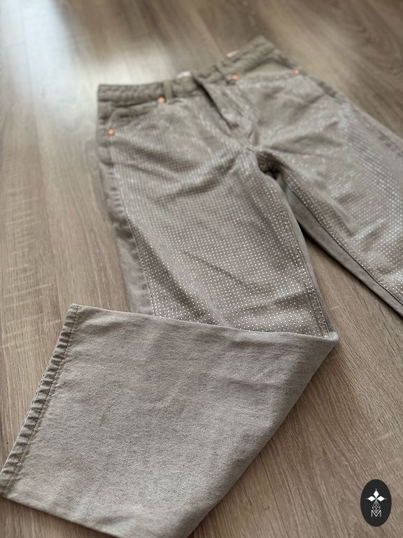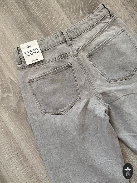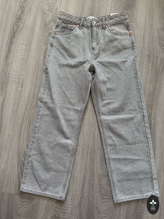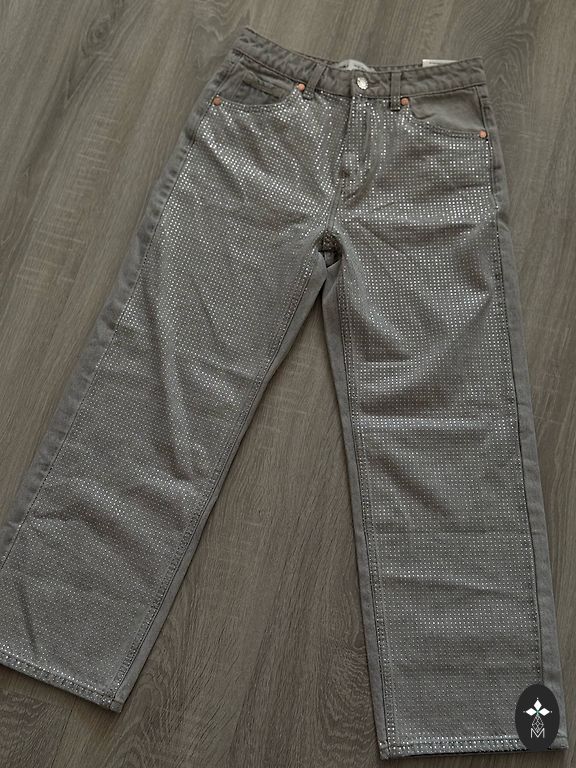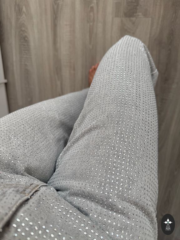 Pilkos džinsai su blizgesiu tiek priekyje, tiek gale. Tankūs.