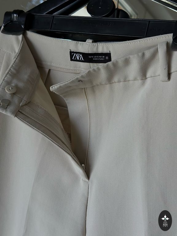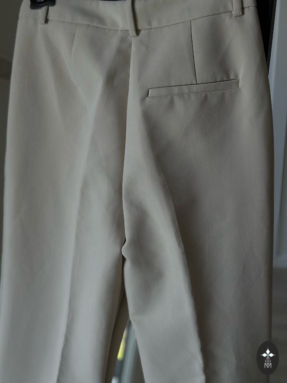 Идеальное состояние.Один раз одевала,не подошёл размер.Красивый песочный цвет.Ткань плотная.В составе 75% вискозы.Хорошо с каблуками и с кроссовками.Длина 100см,талия 35см.Ткань тянется.