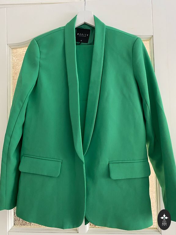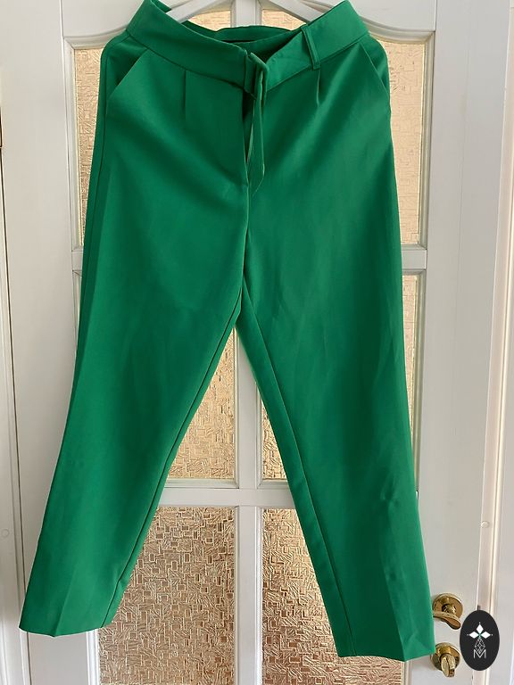 Lengvas, plonas, gražios kelnės su juostelėmis išorėje ir švarko šonuose. Tiek švarkui, tiek kelnėms yra kišenės. Diržas su guma ir sutraukiamu raišteliu. Ilgis išorėje 104, viduje 76, diržo plotis netempiant 39. Švarko ilgis nuo peties 63, pečiai 41, rankovė 62, krūtinė 51, liemuo 42, klubai 49.