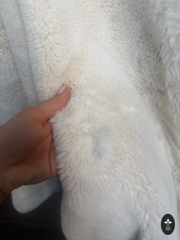 Atkreipkite dėmesį - abiejų rankovių apačioje matomas medžiaga, be kailio. Dėvint paltą šį rankovių „plikumą“ nepastebėsite, tik kai pakeliate rankas.