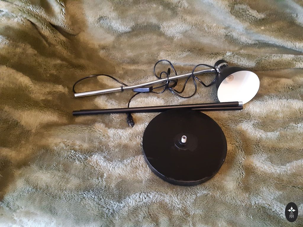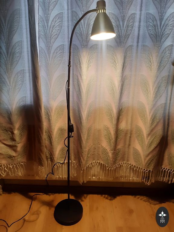 Vintage floor lamp. 1950s! Very good condition. Black element in the middle - leather. Height 141cm, base diameter 26cm. Switch above each shade. Shade diameter 18cm.