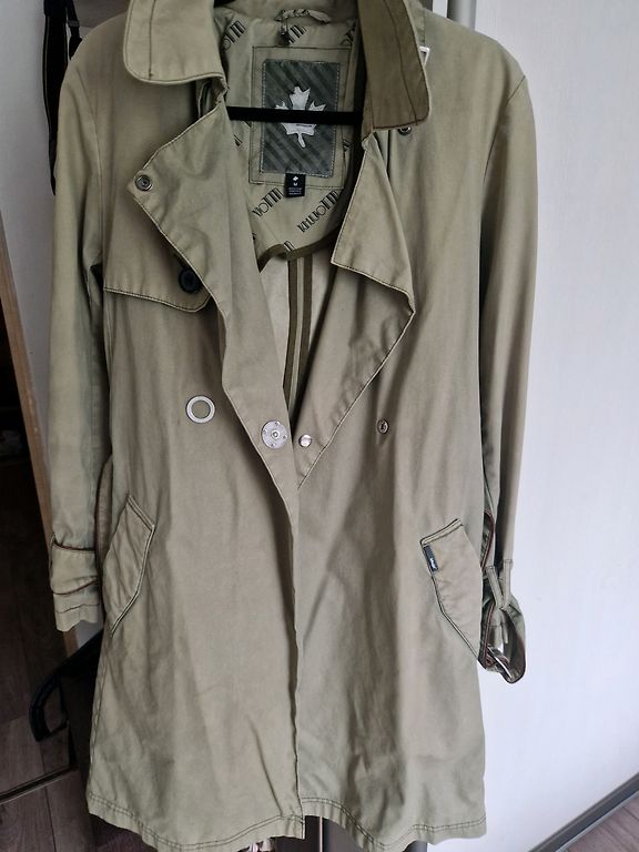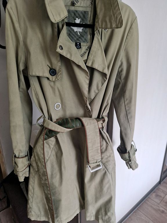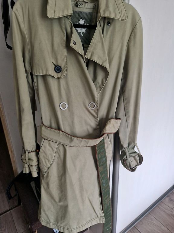 Tamsiai žalias chaki spalvos paltas! Vidutinio storio pamušalas! Yra spaudės 2 eilėse, kišenės! Labai lengvas. Gerai atrodo ir mažesniam dydžiui!