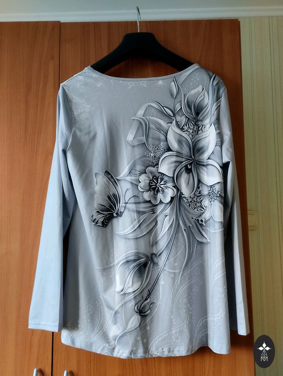 Sidabrinė pilka su gėlėmis V formos kaklu, ilgomis rankovėmis.
