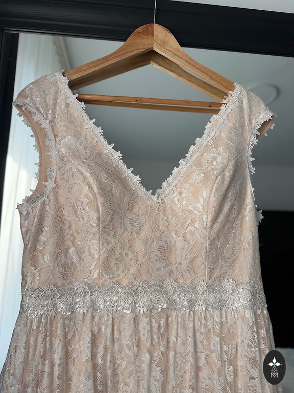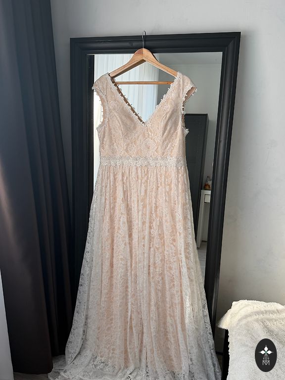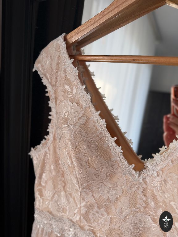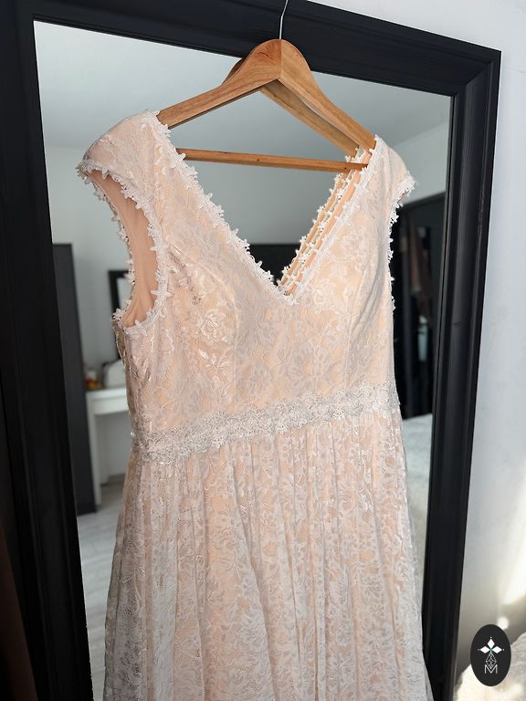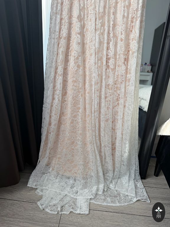 Kleit tellitud salongist, toodud Hispaaniast. Sobib pikka kasvu jaoks (mul 180 cm), kuigi pikkust saab õmbleja juures muuta. Pikkus 167 cm (vööni ülevalt 45 cm, seeliku osa 122 cm), Rinnaosa ümbermõõt 91 cm (tasside all ees 42x2 cm ümbermõõt, 44 cm seljaosas kaenlaaluste vahel), Varruka pikkus 69 cm (mõeldud pikemaks käeosa jaoks), Vöökohas ilma pingutamata 41x2 cm, kuid kõik on pingutatav, korsett koos vööga. Puudusi pole.