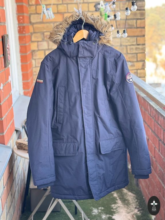 Labai patogi ir šilta mėlynos spalvos striukė su aukšta apykakle, užtrauktuku ir spaudėmis. Striukė gerai prižiūrėta, be pažeidimų, paruošta naudoti.