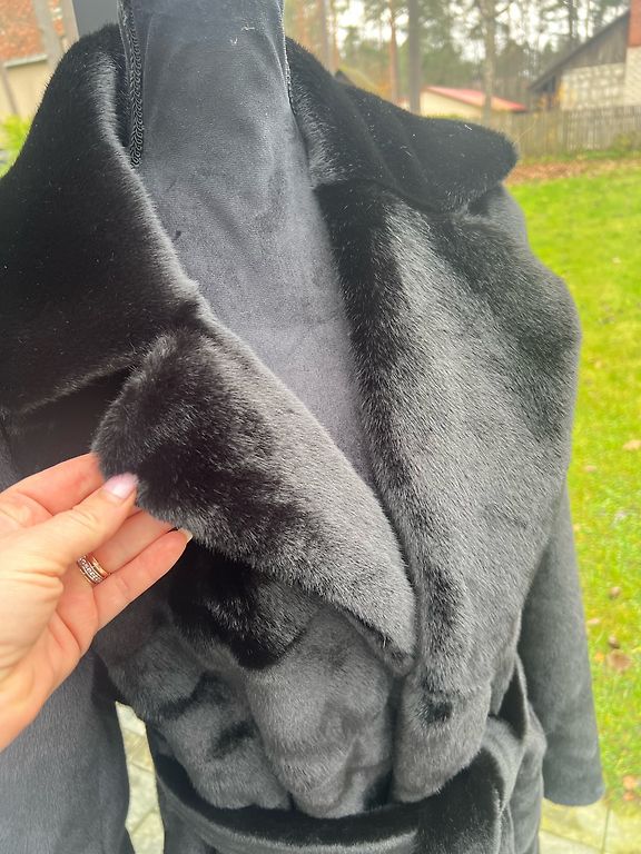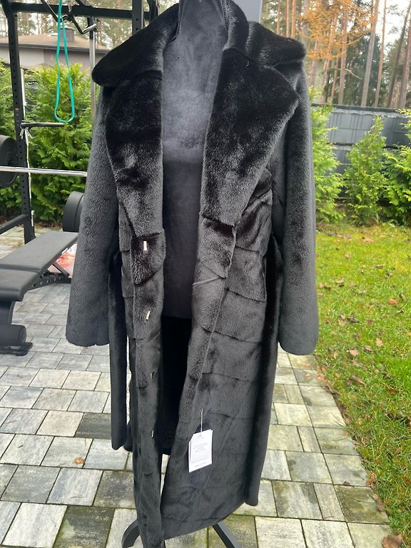New artificial fur coat. Length 75cm. Fits sizes S to M, as the model has a wide cut. Thick luxurious hood.