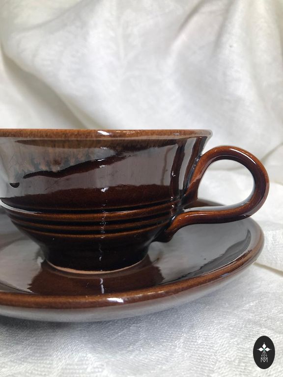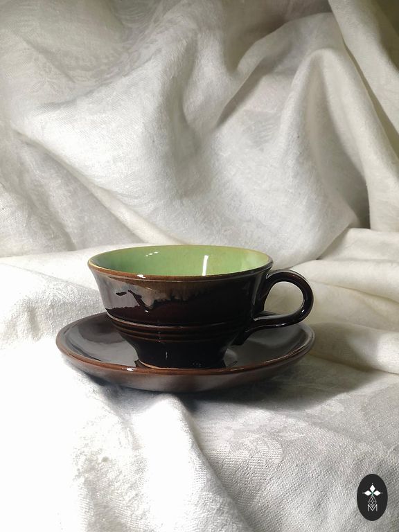 nav lietotas, bez plaisām vai atsitumiem. Divas tases ir perfektā stāvoklī. Vienai tasei ir no rūpnīcas glazūras ražošanas nepilnības gar tasītes augšējo malu.