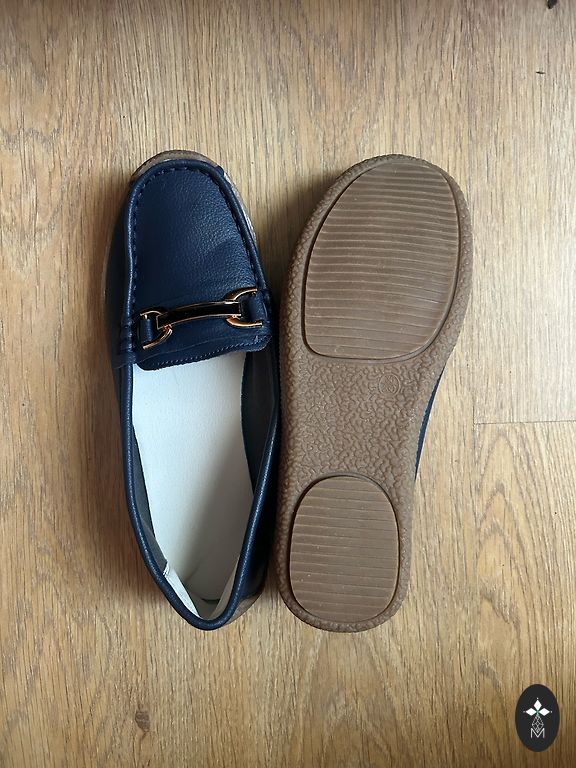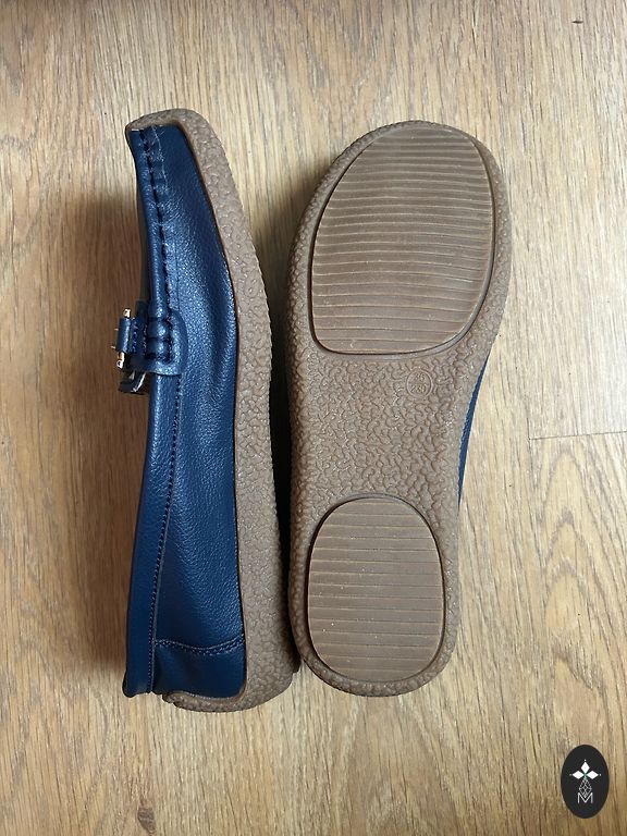 Klasikiniai mėlyni Loro Piana kailiniai loaferiai (ne originalas). Dydis nurodytas 40, mano dydis yra 39 (25,5 cm), man šiek tiek dideli, vidpadį labai tiksliai sunku pamatuoti, manau, kad viduje yra 25,7-25,8 cm. Gražūs ir stilingi batai. Man atvežė, nes Rygoje negalėjau rasti mėlynų batų, bet jie pasirodė per dideli. Spalva tamsiai mėlyna (bet ne labai tamsi). Be originalios dėžutės, kurioje jie buvo, nes nebuvo vietos transportuojant.