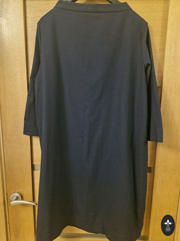 Vilna 75%, poliamidas 25%. Akcentas yra labai moteriškoje kaklo dalies apdailoje - tokia lengvai suapvalinta valtis. Reglano 3/4 rankovės, ilgas užtrauktukas nugaroje. Suknelė pamušalu visame ilgyje. Yra kilpos diržui, galima nukirpti, jei nereikia.