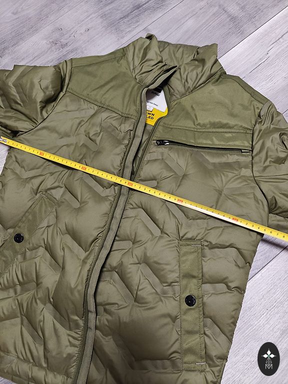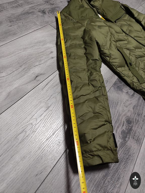 Paks, soe. 30% sulgi, 70% udus. Nagu udusjakkidel tulevad udusuled kohati välja, jäädes riietele. Vasaku käe all logo juures väike plekk ja vasaku tasku peal on plekk, samuti kinnise sees alumisel äärel on kaks plekki.