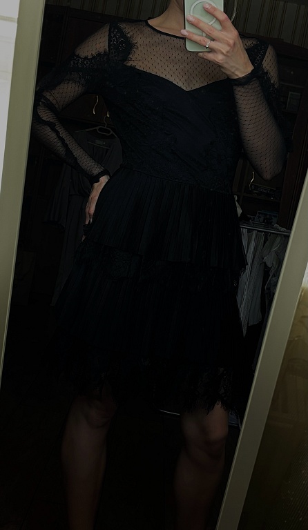 Graži vakarinė suknelė su blizgučiais, V formos iškirpte, prigludusiu siluetu, ilgis 90 cm, gana elastinga ir gerai tempiasi.