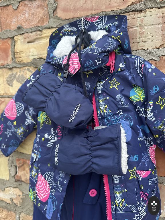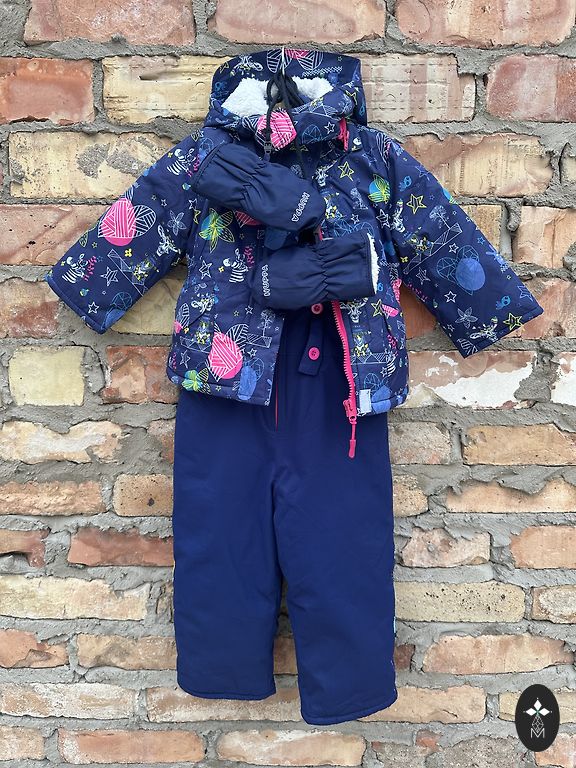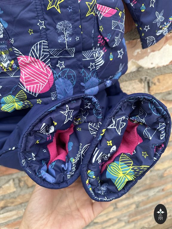 A charming romper from the Finnish brand Lassie, lightweight, practical, and easy to put on, ideal for the little one, with a very beautiful print on a dark blue background, has foot elastics at the bottom, only worn in a stroller, condition is very good, not worn out, the bottom, knees, and sleeves are not scuffed. Size 80