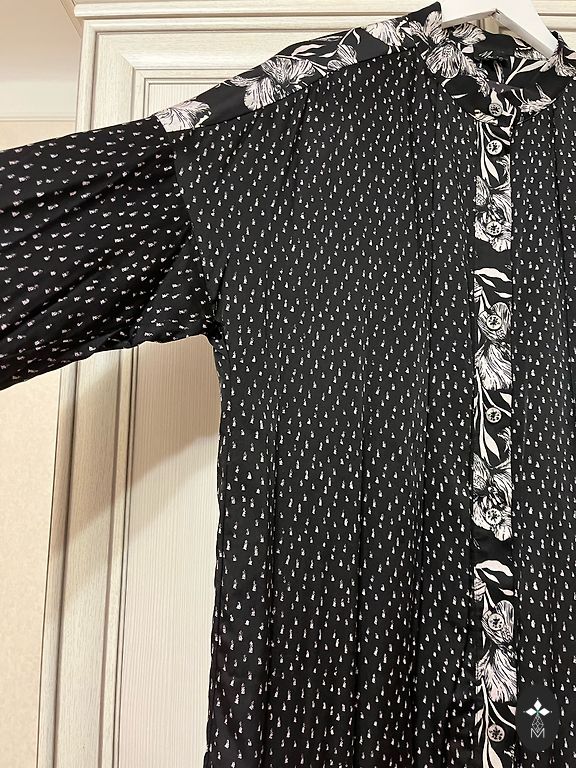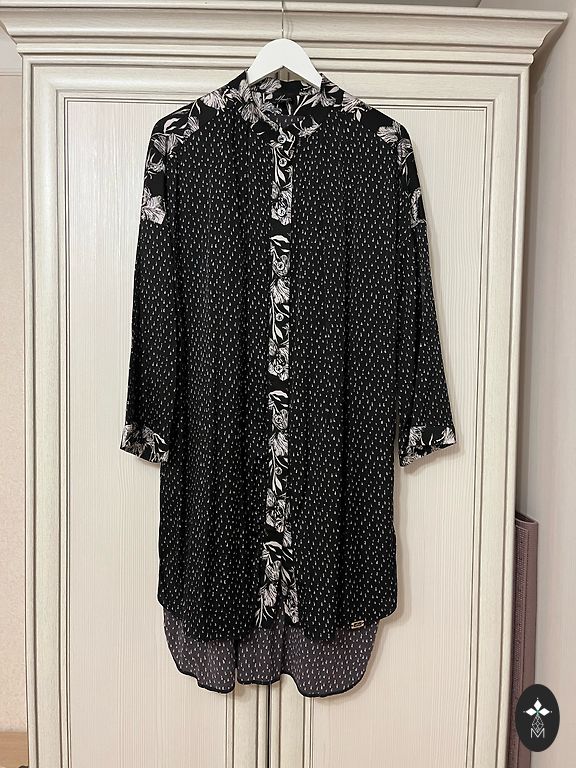 100% siidist pluus, särk. Tõstetud krae. Tagaküljel laienemine. Läbipaistev, kuid triibud loovad salapäratunde. Kirjutatud suurus 40, kuid ütleks, et sobib paremini suurusele 38. Poola bränd Kaaskas. Käe pikkus 58cm, laius 48cm. Hea kapslielement, mida saab kombineerida erinevatel viisidel.