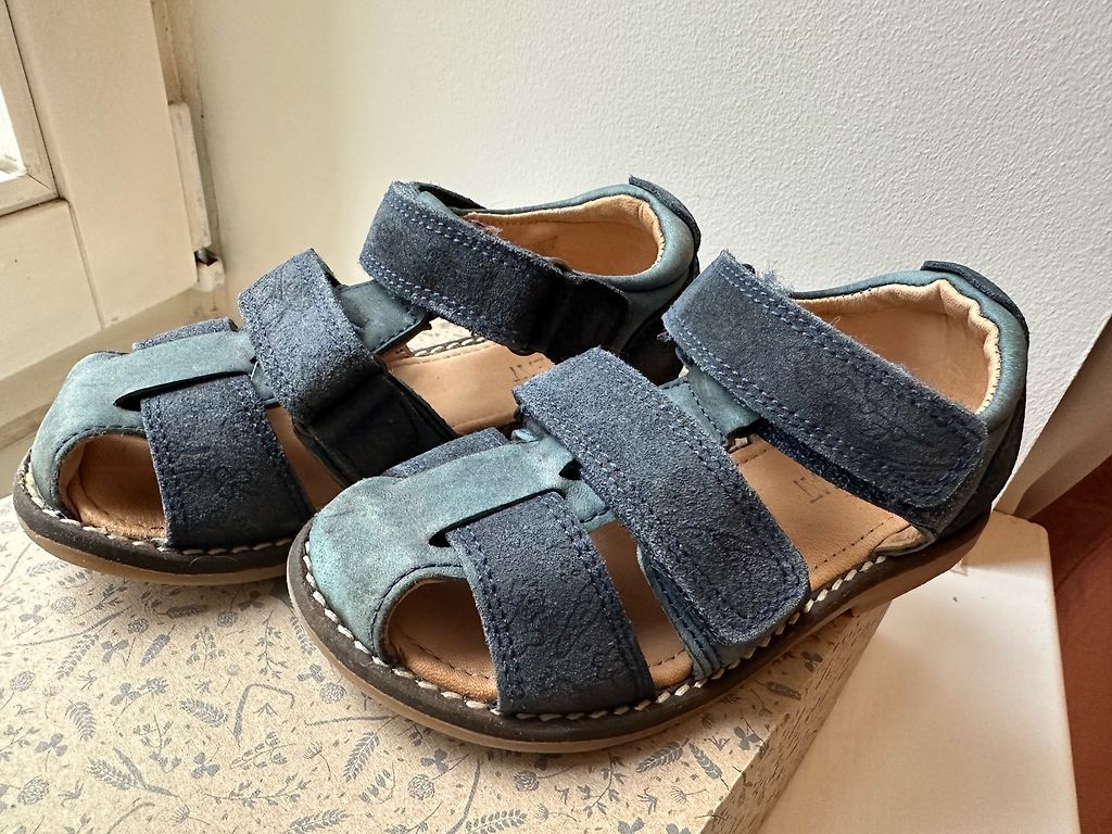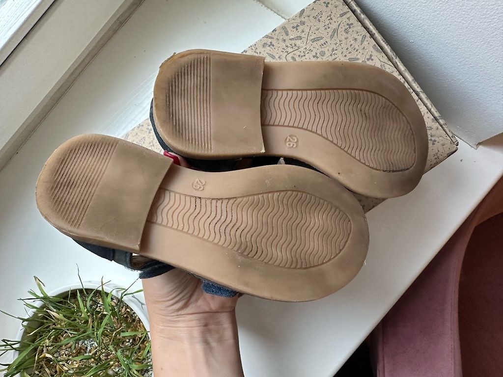 Minkšti, lengvi odiniai sandalai, dėvėti darželyje trumpą laiką.