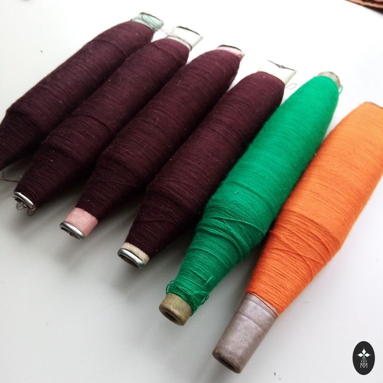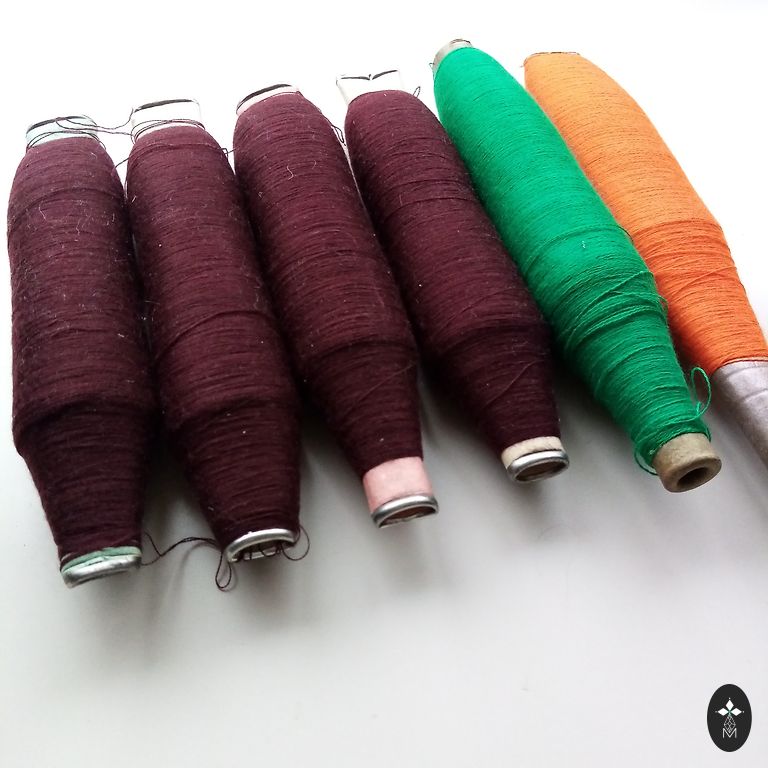 Шелковые нити различных оттенков на больших катушках, использовавшиеся в промышленном производстве в советское время. Катушки не полные, но в любом случае намного полнее, чем доступные сейчас катушки.