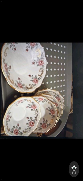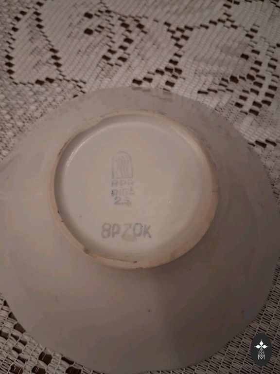 Apvalus fajanso patiekimo lėkštė. Yra keletas juodų taškų ir fajanso indams būdingų senėjimo požymių, kurie matomi nuotraukoje. Skersmuo 24,5 cm.
