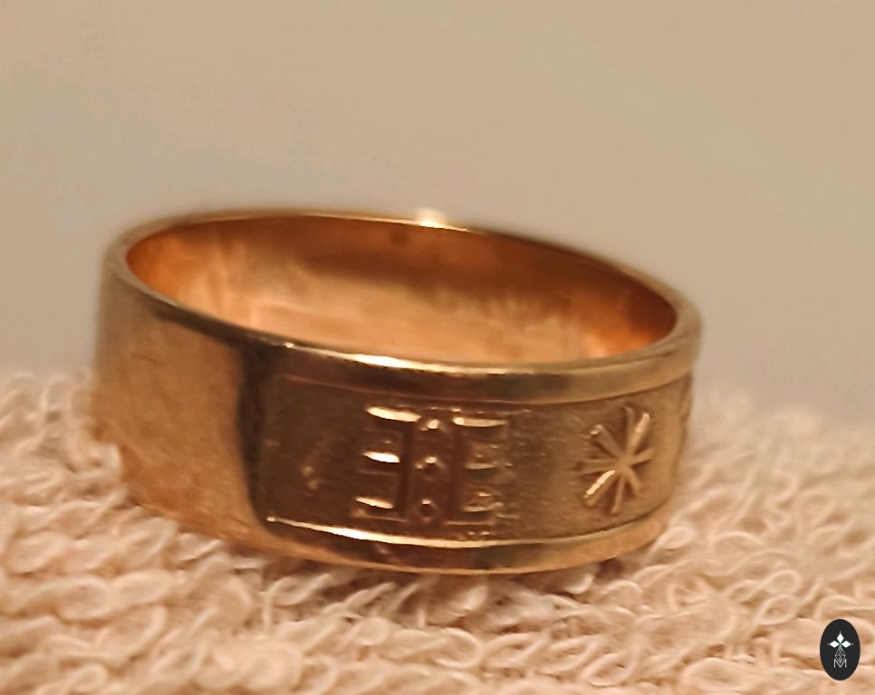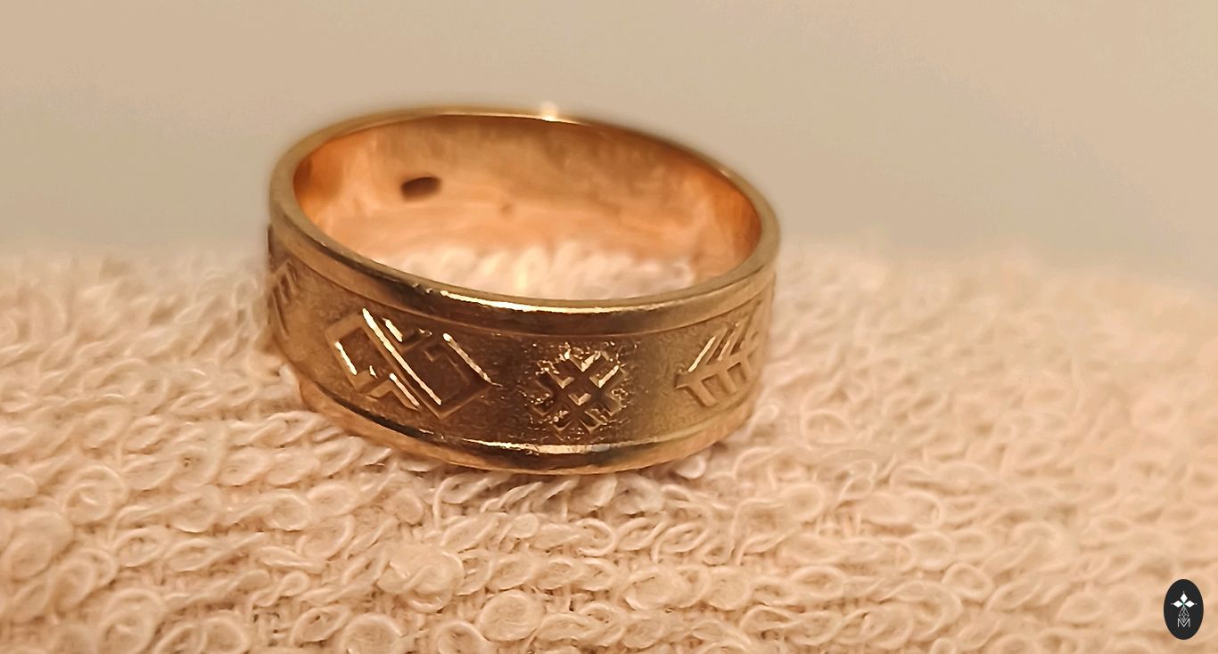 Pagaminta pagal užsakymą, auksas 585, yra praba. Svoris 6.77 gr. Nedideli įbrėžimai - taškeliai šonuose, kurių negalima pastebėti, iš tikrųjų tokį gavau iš meistro. Dydis 17.5. Kaina nesiderinama. Tik susitinku.