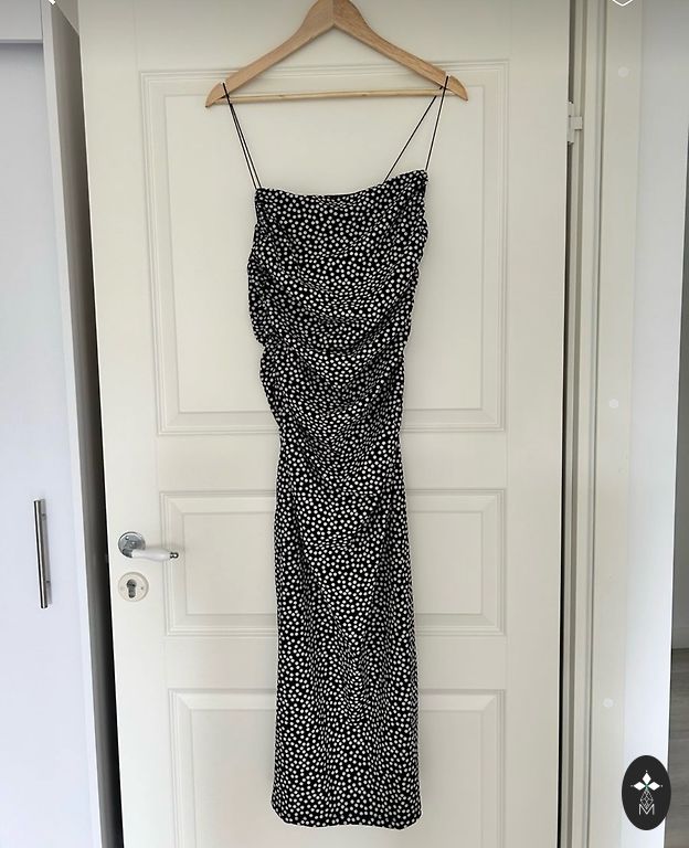 M dydis, dėvėta kelis kartus, kaip nauja, ilgis 134cm, juosmu ant gumos, nesutempta forma 70cm (siauriausia dalis virš bambos), krūtinė apie 100cm. Šonuose kišenės.