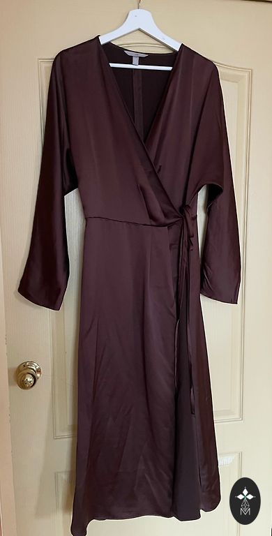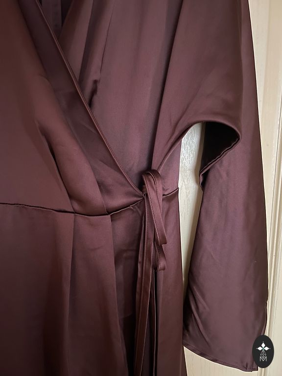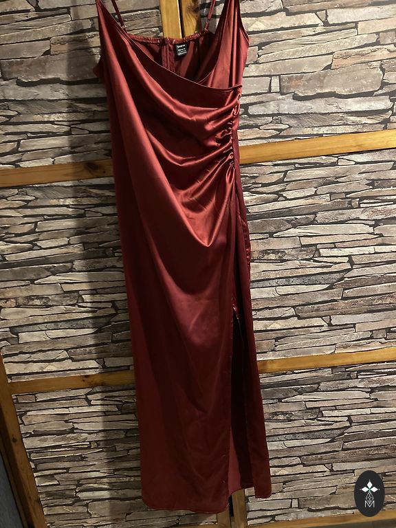 Erepunane, liibuv sidemekleit muljetavaldava avatud seljaga. Veniv materjal. Seljaosa on rikkalikult kaunistatud sädelevate kivikestega, mis säravad valguses väga kaunilt ja annavad kleidile luksusliku välimuse. Kantud ainult 1 kord fotosessioonil. Fotol pikkus 178 cm. Kleidi pikkus 82 cm.