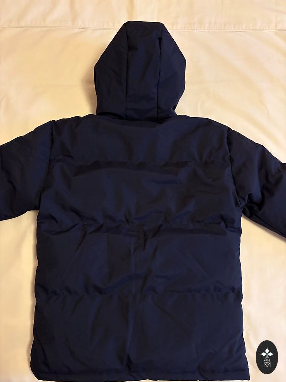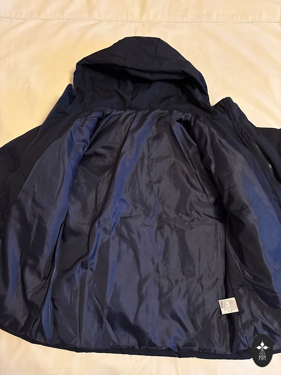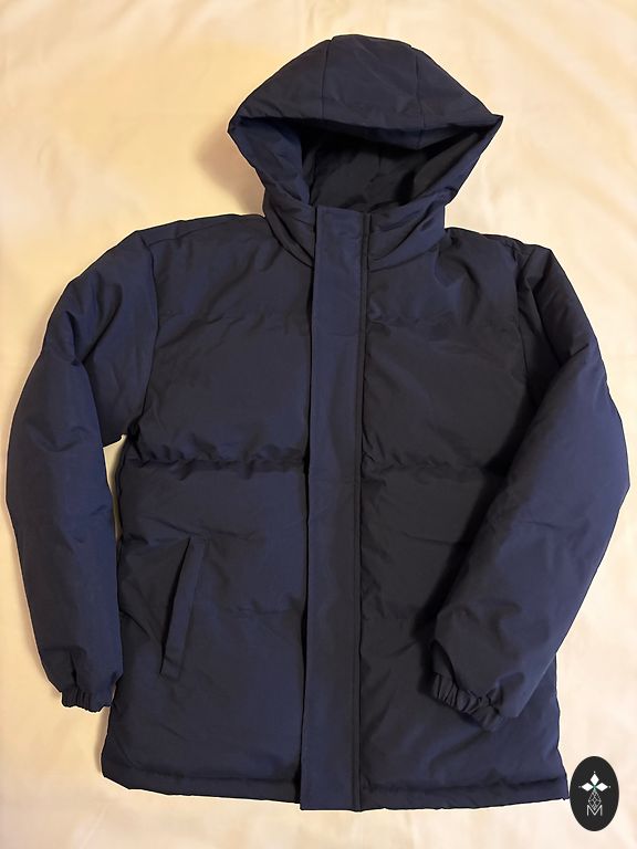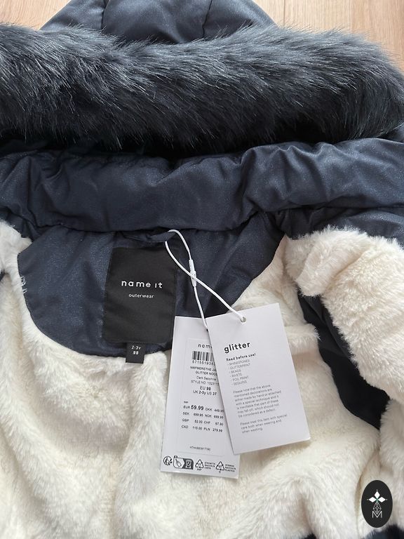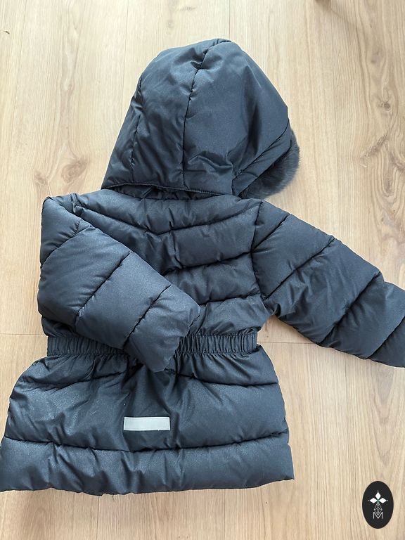 Müüa uus XS suuruses jope - Tepitud, tumesinine kapuutsiga jope, millel on taskud külgedel. Sellel on tõmblukuga kinnitus nööpidega, kunstkarusnahk allosas, kapuutsi küljes, krae peal ja varruka otstes, standardlõige. 2. foto ginatricot veebilehelt.