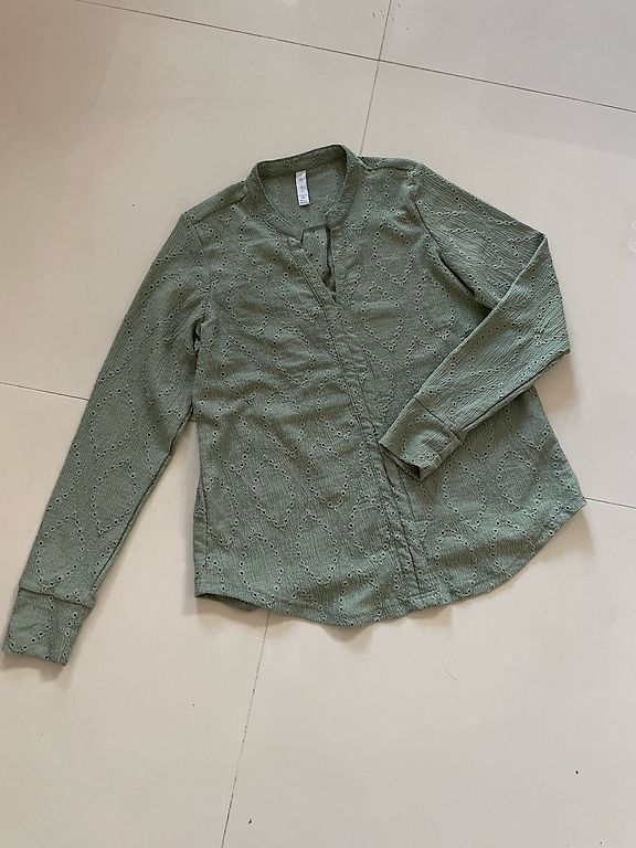 Olive (khaki) colored blouse with a golden sheen. Chest 55 cm. Good length — when worn outside pants or leggings, it covers the buttocks, but when tucked into pants or skirts, it has a beautiful drape.