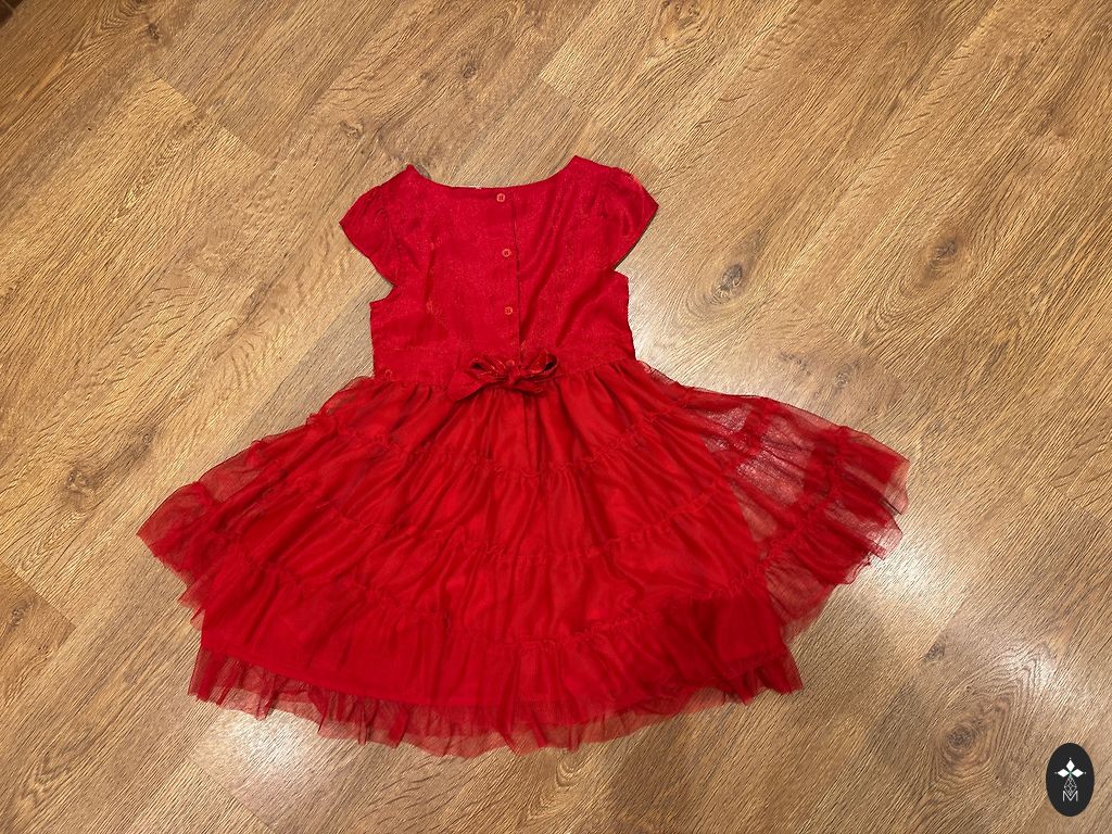 Red and gorgeous dress for ~1-year-old. Size indicated is 12 months. I think it might be around ~size 74. The dress is like a "bodysuit" with layers of tulle ruffles. The back of the top is quite elastic. Dress length is 41 cm.