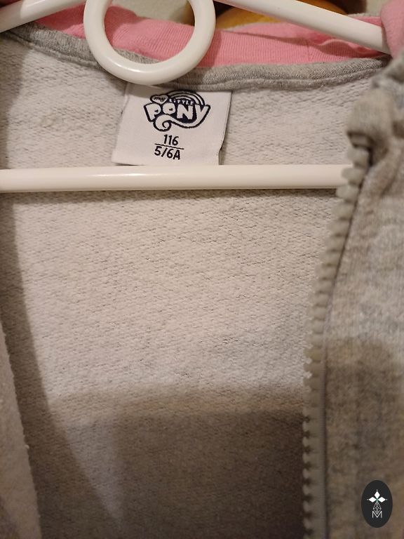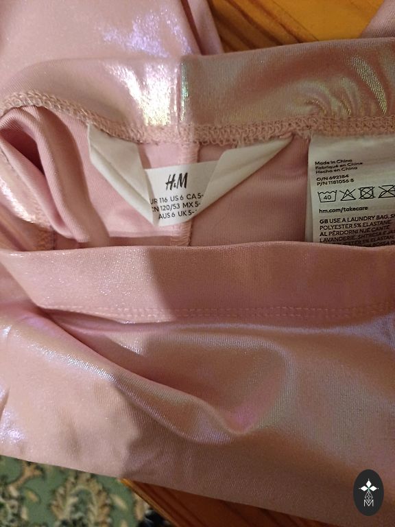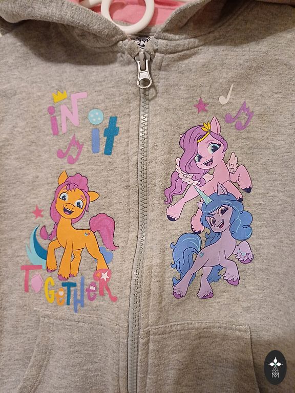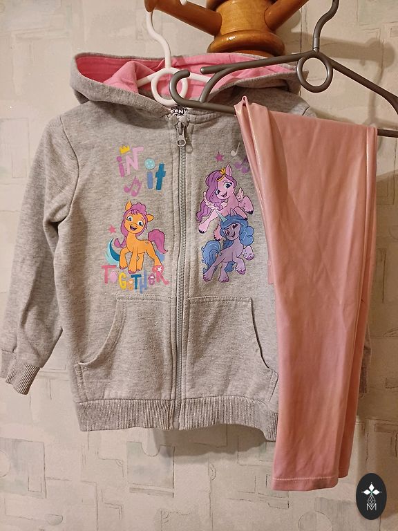 One pair of pants is size 122, the other is size 128. The sweater is dark gray, size 122/128. The sweater has a small stain that is visible if you look closely.