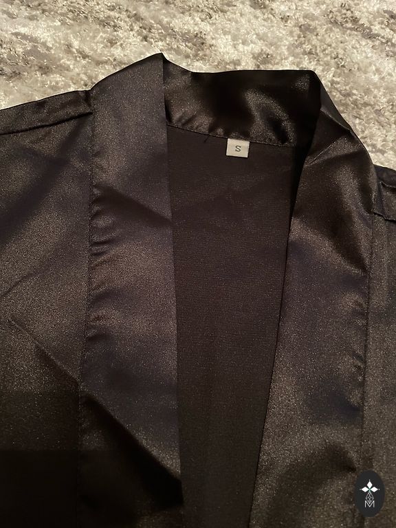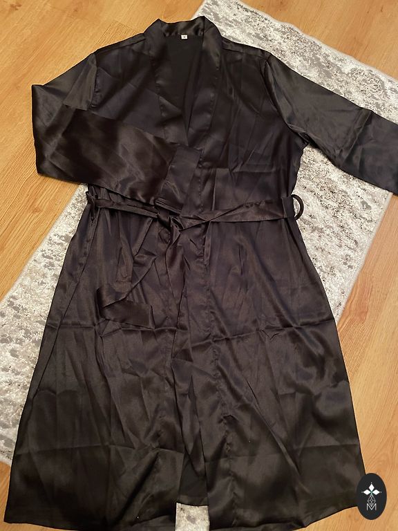 Skaists halātiņš, zeltā krāsā ar melnu samta jostiņu un mežģīnēm. Īstā krāsa 3.bildē.