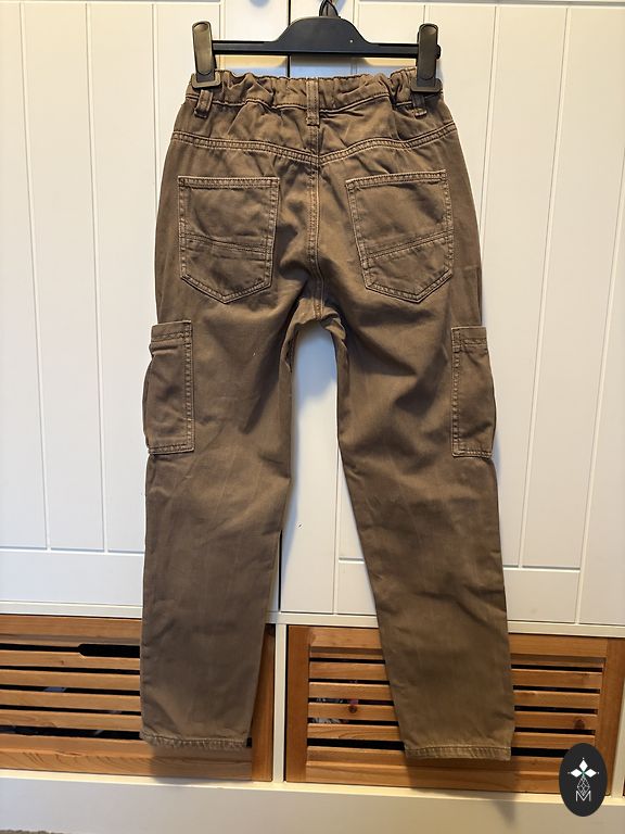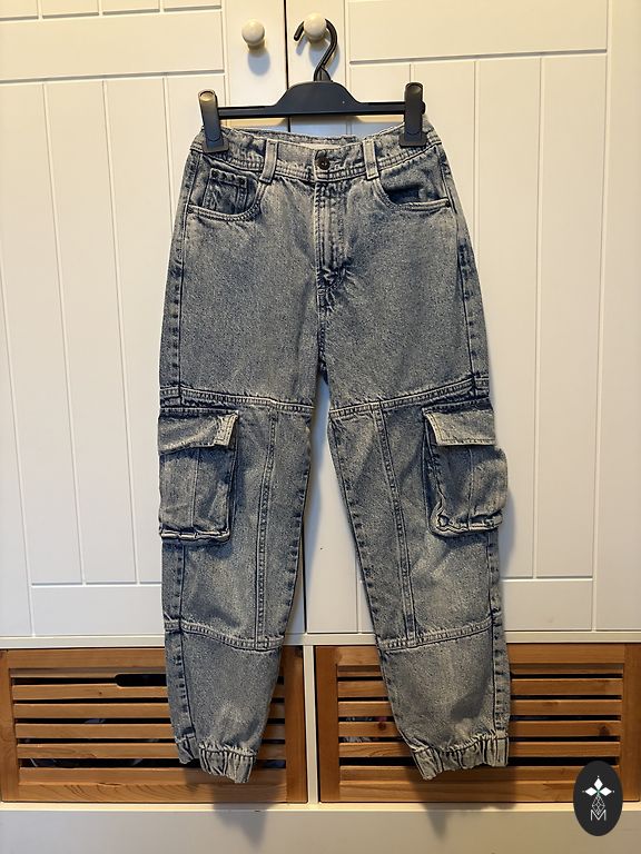 Be defektų, aktualus kirpimas, ilgis nuo juosmens iki klešnės apačios 89 cm plius diržas 4 cm, plotis gale 45 cm, juosmu galima reguliuoti. Pridedu panašaus modelio žalsvai mėlynus ZARA džinsus 152 cm su nedideliu nusidėvėjimu priekyje. Vos pastebimas.