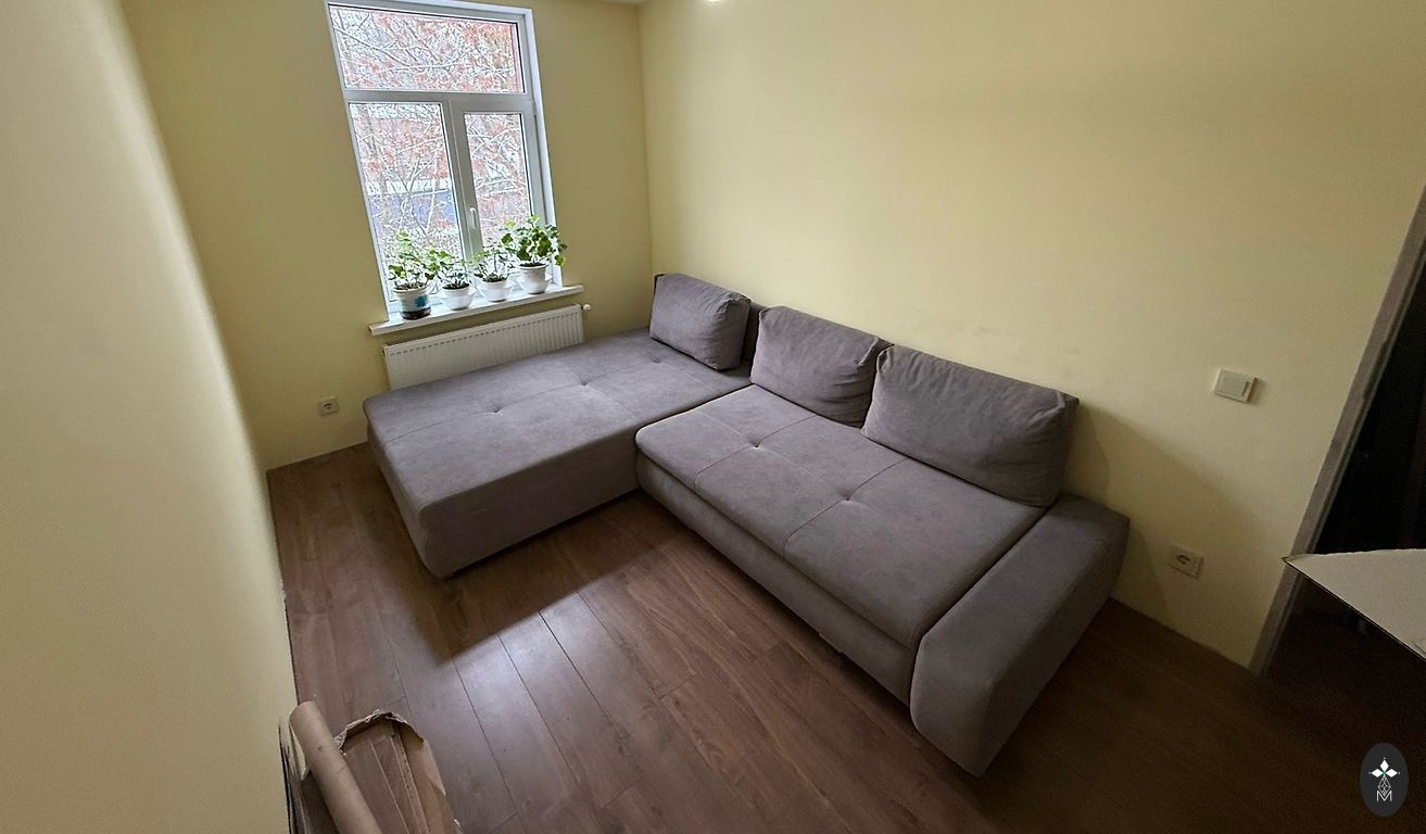 Matmenys: ilgis 295 cm. Giliausia kairiojo kampo kraštinė 160 cm. Mažiausia (dešinysis kampas) 95 cm. Sėdimos vietos gylis 70 cm. Pridedame pufą (nors ir iš IKEA, bet gerai dera kartu) ir pagalves: 3 mažos ir 1 didelė.