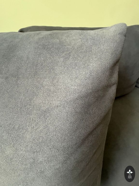 Sofa yra iš audinio (lengvai prižiūrima), nėra aksomo/velveto.