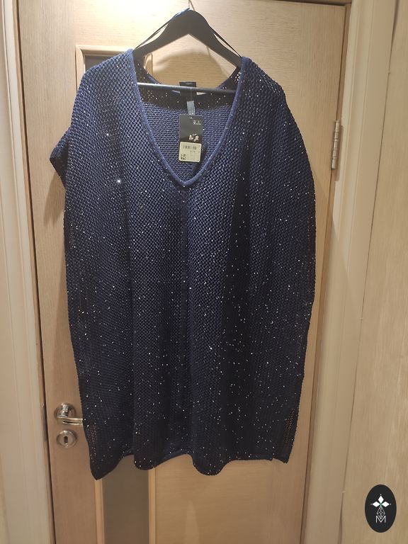 Svētku kleita ar spīdumiem, pirkta Ullas mājaslapā ar atlaidēm, izmērs 46/48. Audums mīksts poliesteris, staipīgs, neburzīgs, ar oderi. Uz gurniem 135 un krūtīm 125 derēja ļoti labi. Garums 116 cm. Krāsa drīzāk bordo, bet uz bildēm spīduma dēļ izskatās spilgti violēta. Pielaikot var Rīgā, Teikā, sūtu uz jebkuru pakomātu.