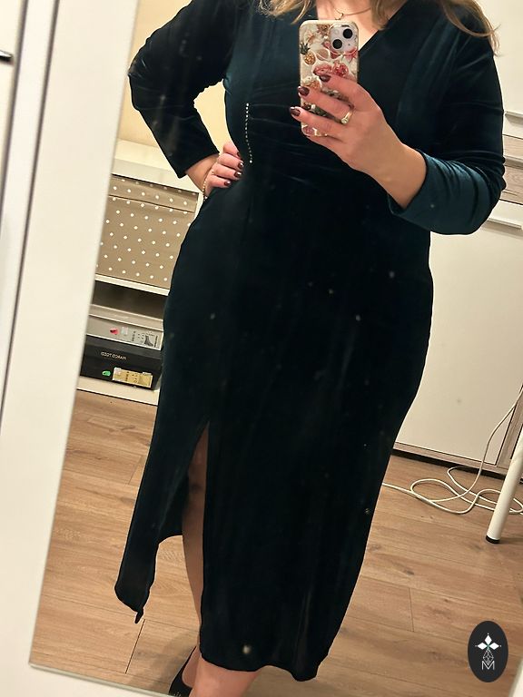 Dark green velvet dress for celebrations. Beautiful shade. Slit on one leg - stretchy. Worn a few times to events - won't be needed anymore.