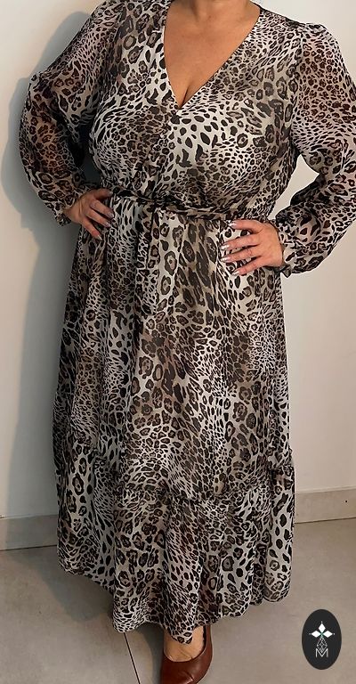 Maxi pikkusega lilla kleit. Ees dekoratiivsed nööbid, vöökohal seotav vöö. Puhevad varrukad elastse mansetiga. Kleit on selja tagant veidi pikendatud.