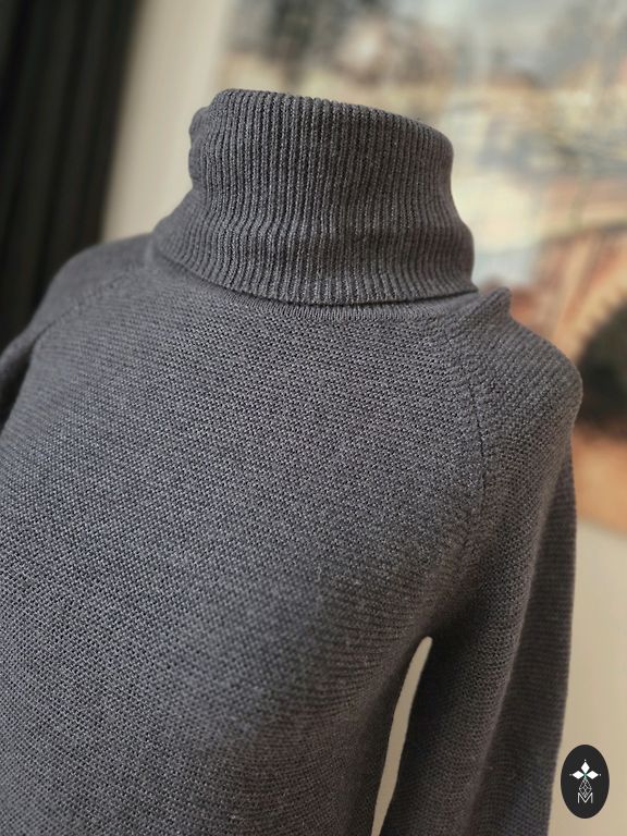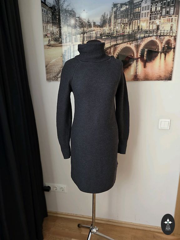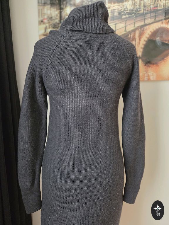 Šviesiai pilkai mėlyna megztinio suknelė. Ilgis - 78 cm. 40% vilna, 60% akrilas.