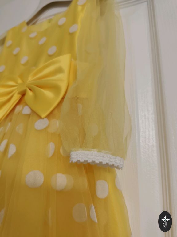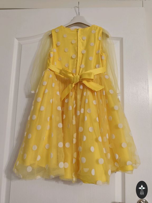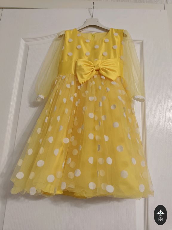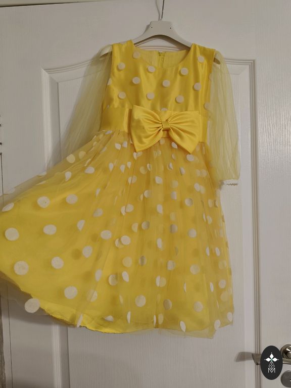 Gana ilga eleganti suknelė, skirta 122 arba lieknam 128 dydžiui, plotis krūtinėje po rankovėmis yra 30 cm. Apatiniai sijonai keliuose sluoksniuose. Suknelė buvo dėvėta kelis kartus, vienintelis defektas (pataisomas), kurį matau: pradėjo irti siūlė pažastyje, žr. nuotrauką. :)