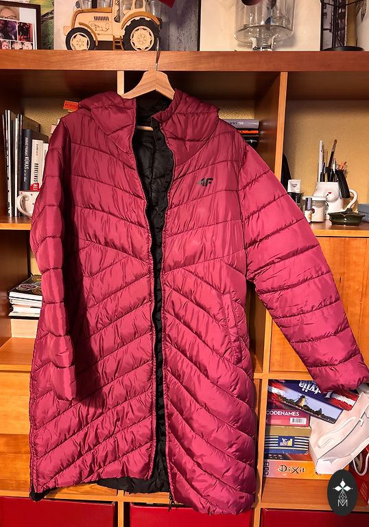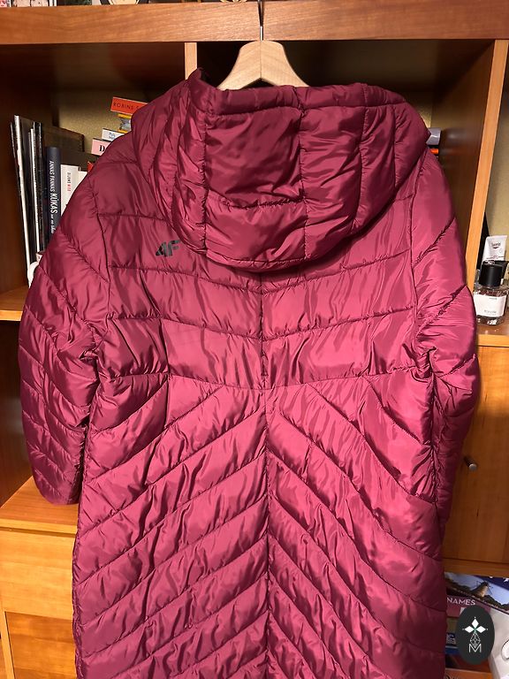 Rindkeres 116 cm, pikkus 104 cm, varrukad 63 cm, naturaalne karusnahk krae, kantud 2 korda, ilma defektideta, krae saab eemaldada, puusad 124 cm.