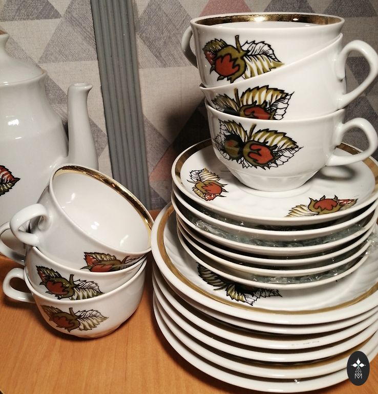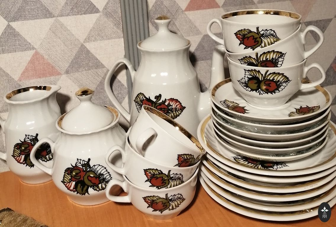 Trīs priekšmeti - kafijas kanna, krējuma trauks, cukurtrauks. Bez šķembām un plaisām, apzeltījums bez zaudējumiem. Cena par visu.