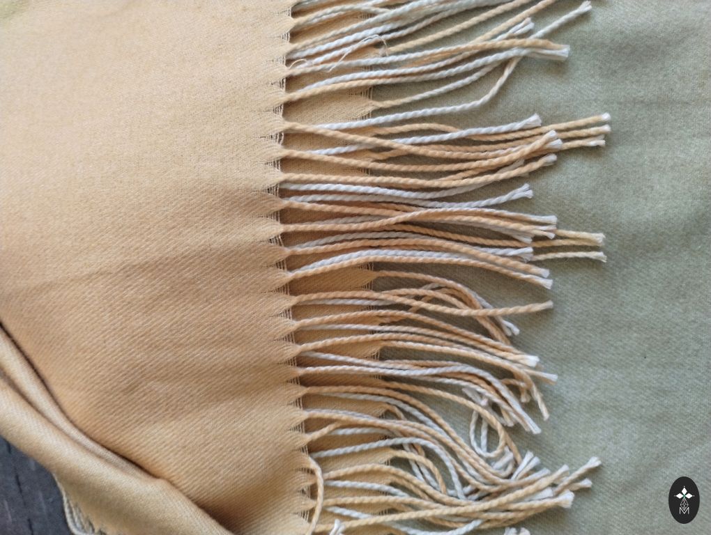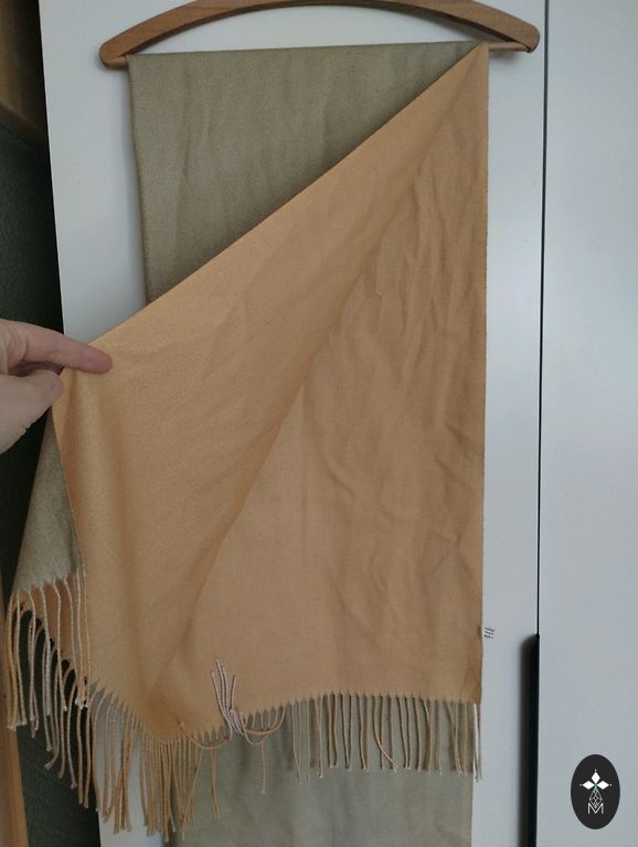 Kašmyras. Raštuotas (žirniai derinami su linijomis). Spalvos ramios. Dydis 70x197.