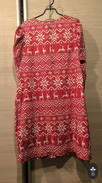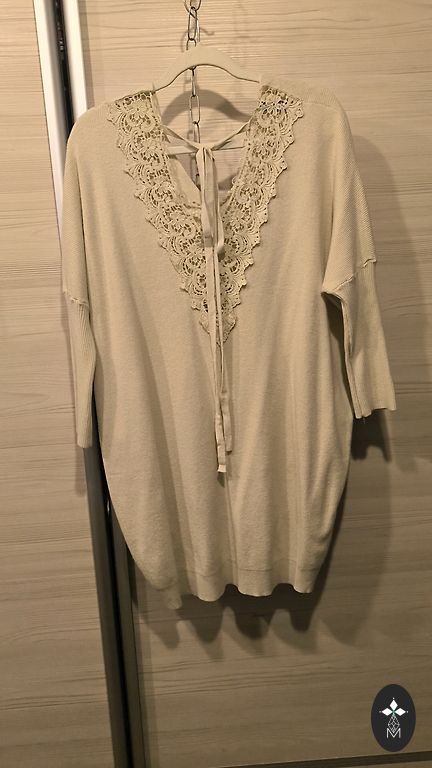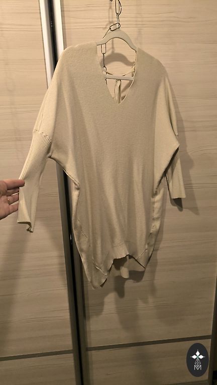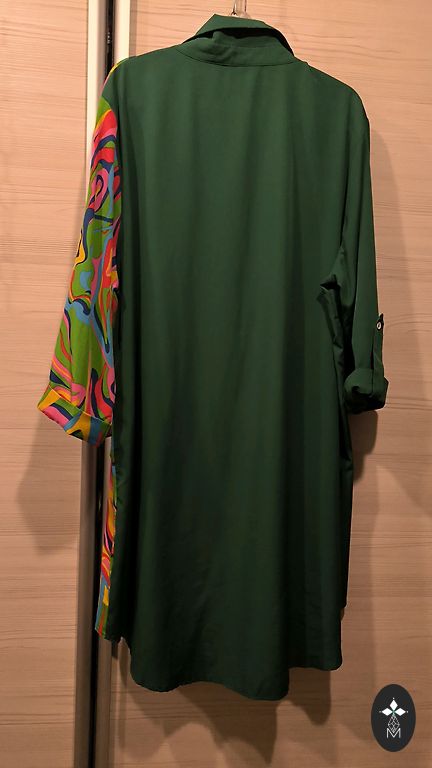 Didelio dydžio juoda ir smėlio spalvos suknelė.