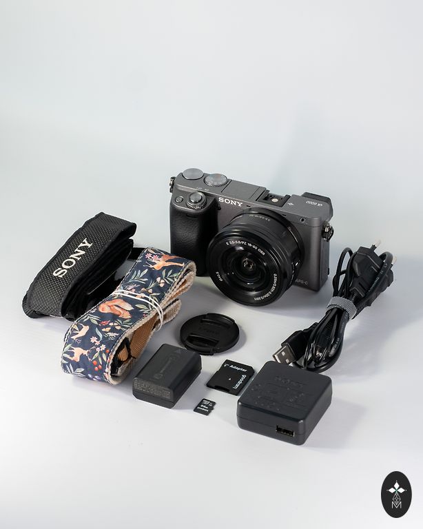 Komplektā: Kamera, objektīvs, 3 baterijas, lādētājs, telefona turētājs un oriģinālais iepakojums.