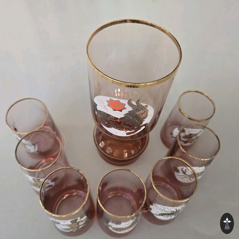 6 duetas ir pieno indas. Žalie antspaudai, atitinkama kokybė. Nėra įtrūkimų ir įbrėžimų, yra glazūros trūkumų, kraštų šlifavimas. Kaina už viską kartu.