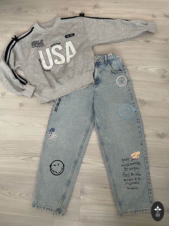 Комплект, джинсовая куртка и джинсы. Джинсовая куртка в состоянии новых вещей, так как надета x1 раз. На джинсах очень-очень слабое изменение цвета на коленях, которое очень трудно заметить, если очень стараться придраться и всмотреться, даже при дневном свете (пытался сфотографировать на
