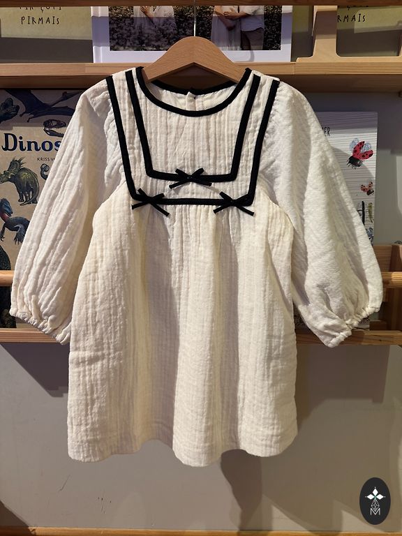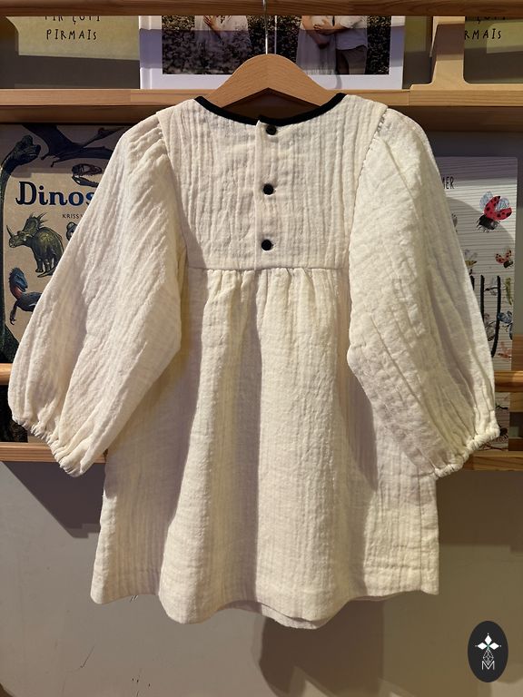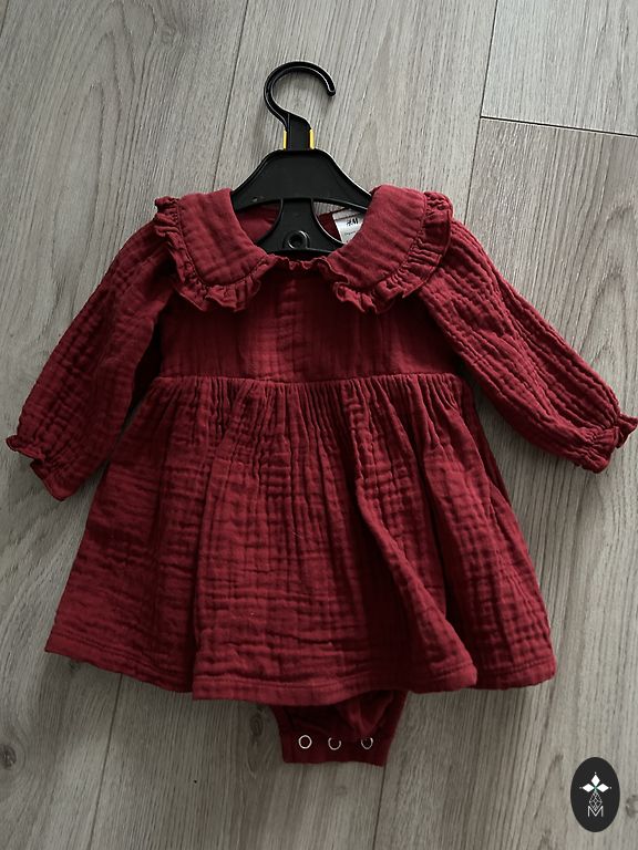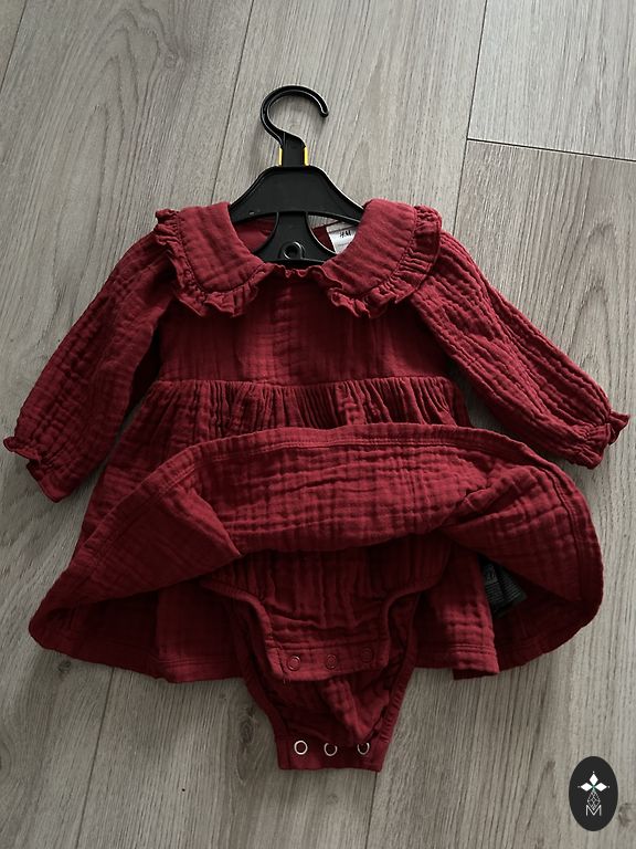 Tankus audinys su nedideliu blizgesiu, balta pamušalu ir puikiu kirpimu – suknelė žiemos sezonai tiks tinkama 98 arba lieknam 104.